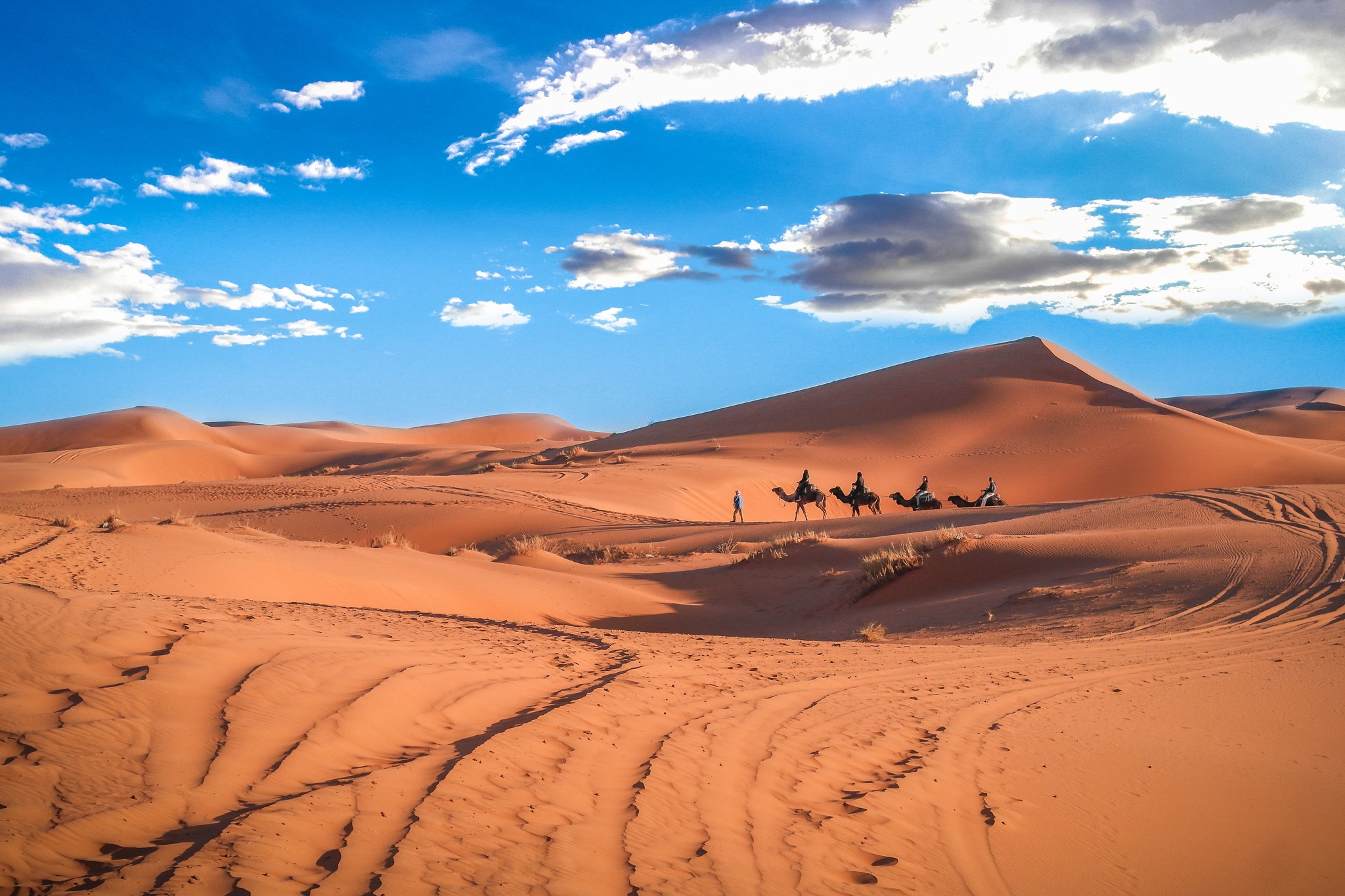 We will pick you up and start your Merzouga desert tour exploring all the interesting sites around Erg Chebbi dunes such as the seasonal Lake of Merzouga named “Lake Sirji”, Khamlia village for GNAWA music, Mines for a variety of stones called “Mifis” to nomad families ending by a visit to Rissani Market, the biggest souk in the area. Arriving in the afternoon then free time for the rest of the day before spending the night at a luxury desert camp in Merzouga.