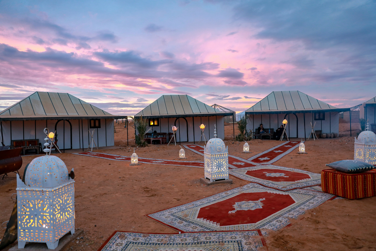 Today, your private Fes to Marrakech desert tour will starts from your hotel or riad in Fez driving across the Middle Atlas and cedar forest. Along the way we pass through Ifrane, which is a famous ski resort, then Midelt, famous for minerals and apples. We continue via Ziz valley to reach Erfoud, famous for fossil products, and then to Rissani. Next, once we arrive in the Erg Chebbi desert where we meet our camel man. We prepare for a camel ride across the Merzouga sand dunes during sunset and enjoy some local music around fire and sleeping in Sahara desert camp. Overnight in desert camp in Merzouga.